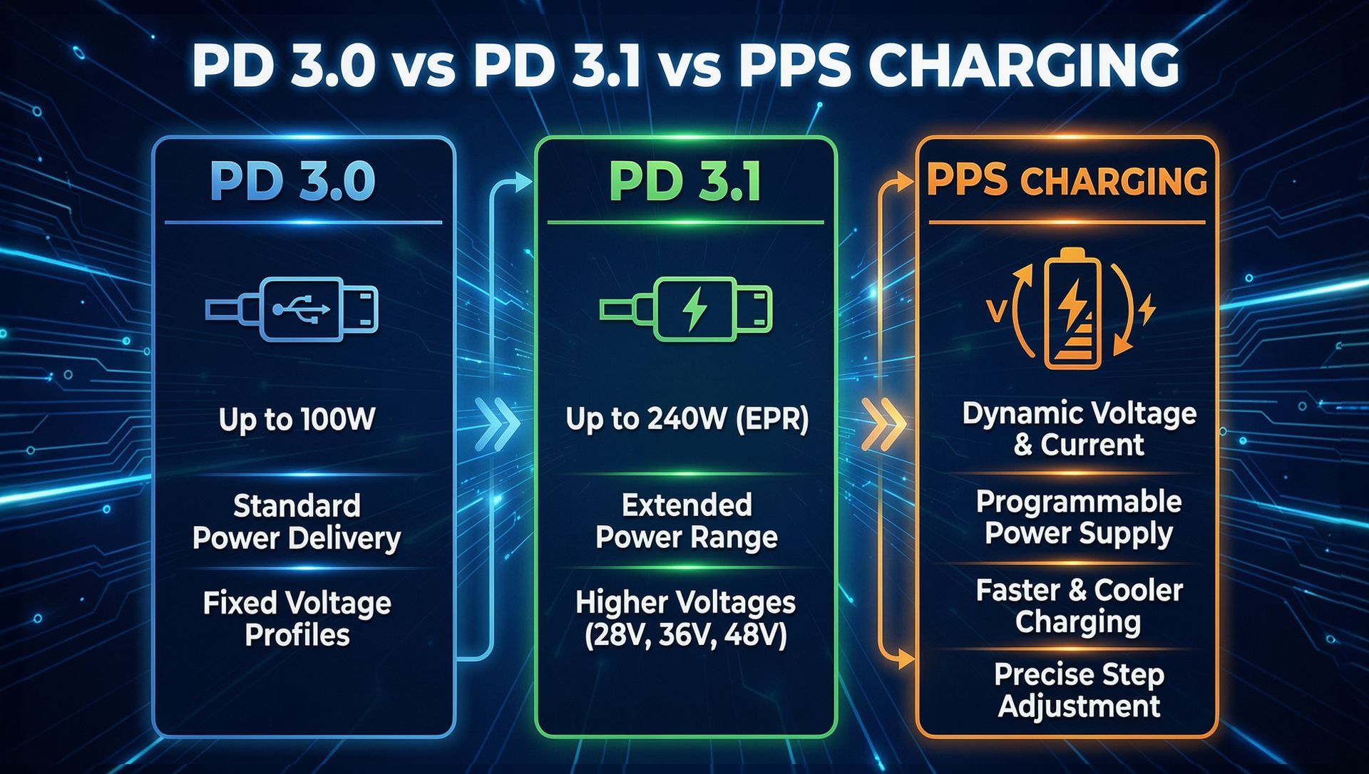 Fast charging is no longer just about speed; it is about efficiency, safety, and compatibility across multiple devices. USB Power Delivery has become the industry standard for modern charging, powering everything from smartphones to high-performance laptops through a single USB-C connection. Understanding the differences between Power Delivery 3.0, Power Delivery 3.1, and Programmable Power Supply (PPS) helps make sense of how today’s chargers deliver more power, adapt to device needs, and remain future-ready.